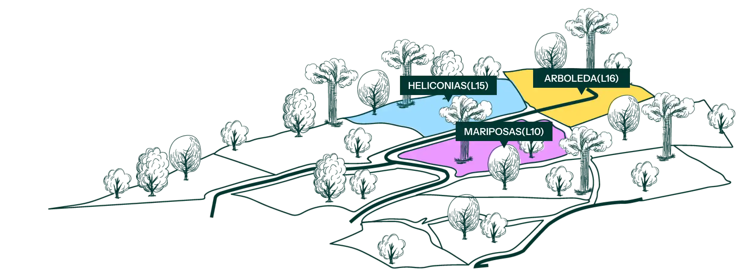 Lotes desde 2,600 m², con explanación y accesos vehiculares, integrados en un área total de 83,000 m² que incluye reserva forestal, agua, vías internas y zonas de esparcimiento